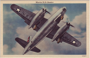 An arsenal for bombardment and self-defense in air combat ... the new Martin B-26 flying torpedo for the U.S. Army is now in mass-production. A streamlined, semi-high-wing medium bomber ... with retracting tricycle landing gear ... two 18 cylinder, 1850-horsepower engines ... gross weight of 26,625 pounds ... the B-26 is the single mass-production type which Martin is manufacturing for the Army.